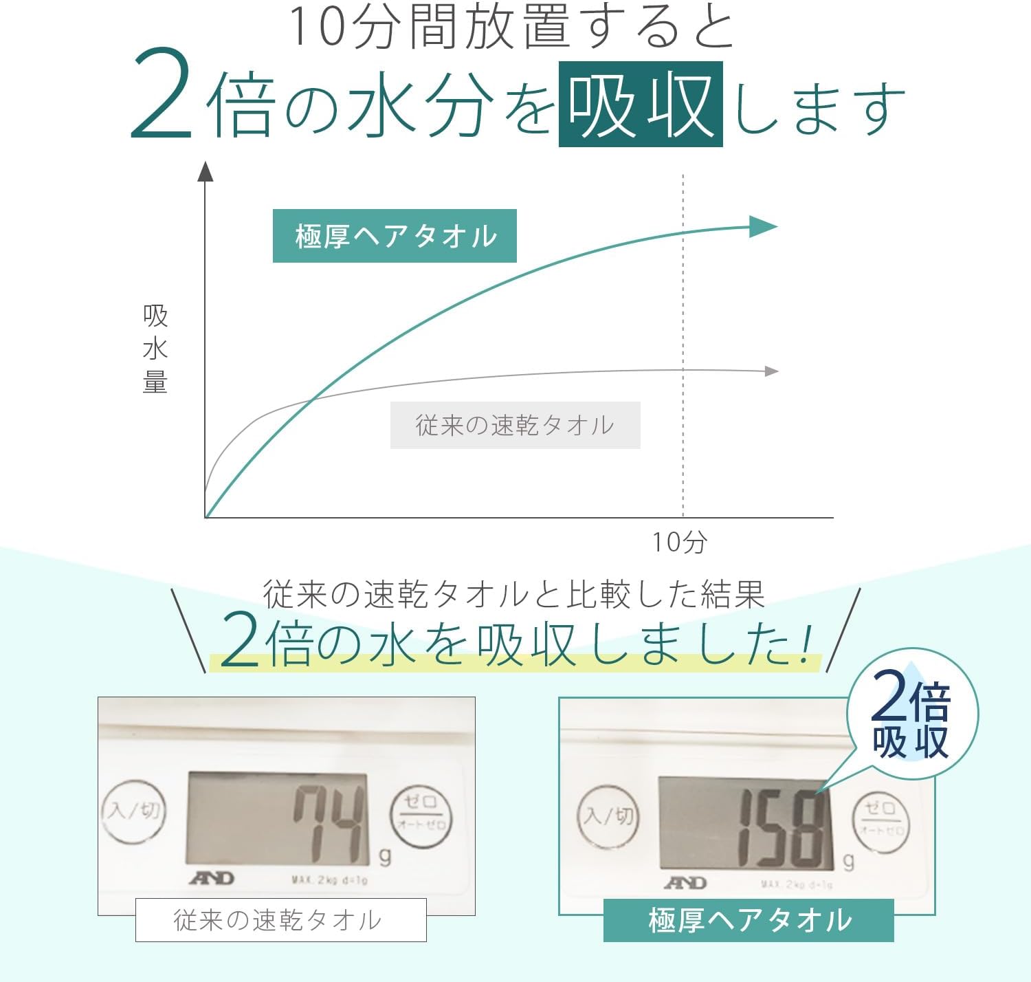 従来のマイクロファイバータオルと極厚ヘアタオルを比較テストしたところ、10分後には約2倍の水分を吸収しました。